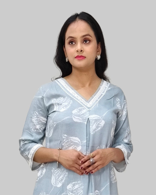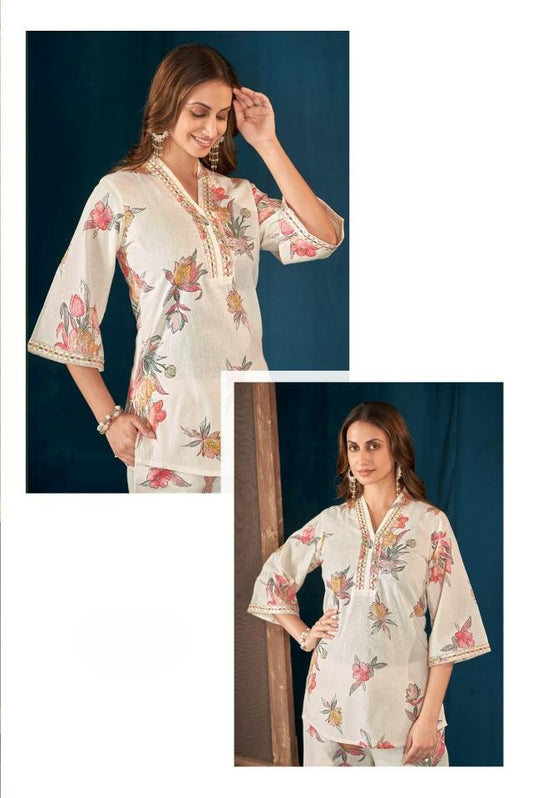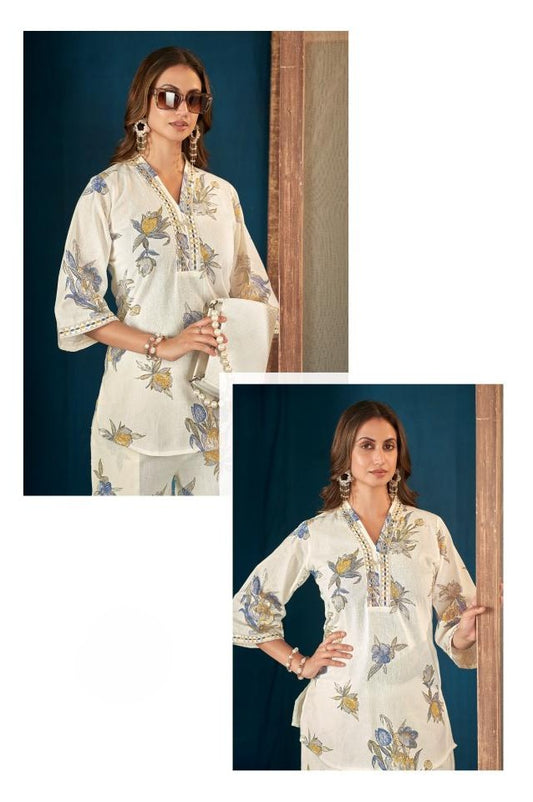 Elegant Floral Print Embroidered Pure Cotton Top With Palazzos Co-Ord Set