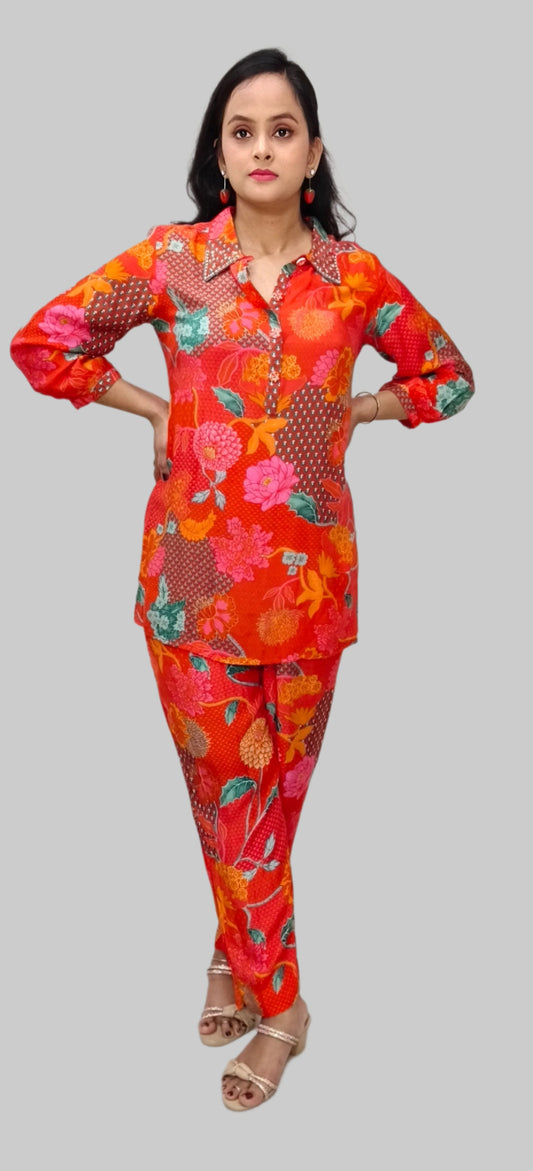 Vibrant Floral Co-ord Set: Bold Elegance in Red and Orange