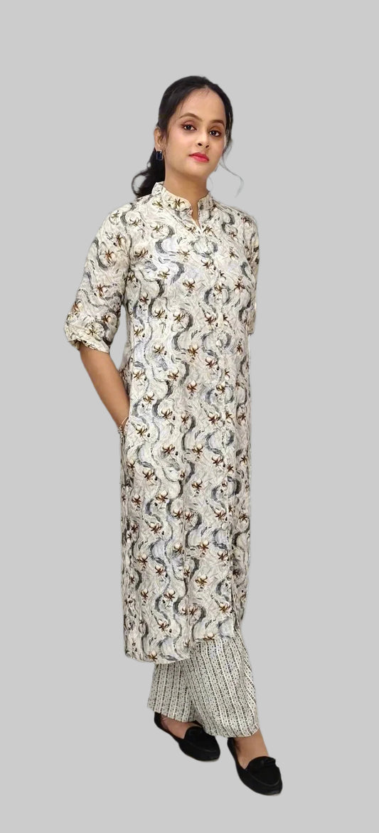Cream-Grey Co-Ord Set with Abstract Prints, Mandarin Collar & Wide Pants