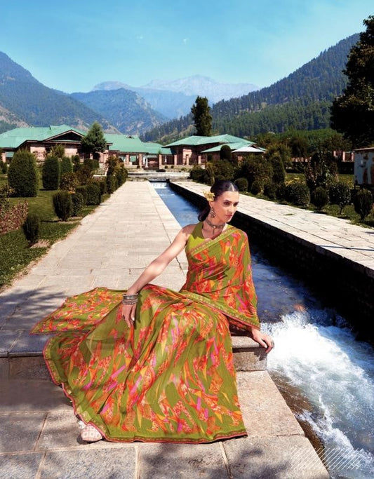 Ivory Bloom – Multicolor Leaf Print Soft Silk Saree