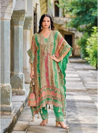 Elegant Multicolor Kaftan Style Embroidered Suit Set - Green