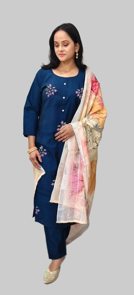 Navy Blue Embroidered Suit Salwar with Vibrant Floral Dupatta