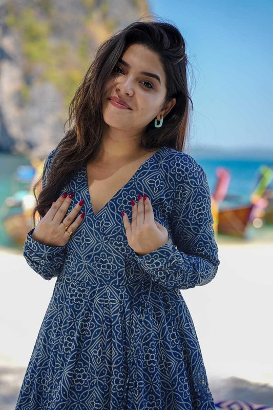 Indigo Blue Ajrakh Printed Anghrakha Kurti set!