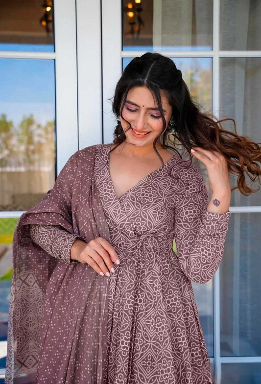 Wine Purple Floral Printed Anghrakha Kurti set!