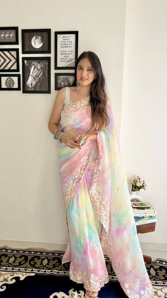 Pastel Rainbow Ombre Georgette Saree with Sequin Embroidery