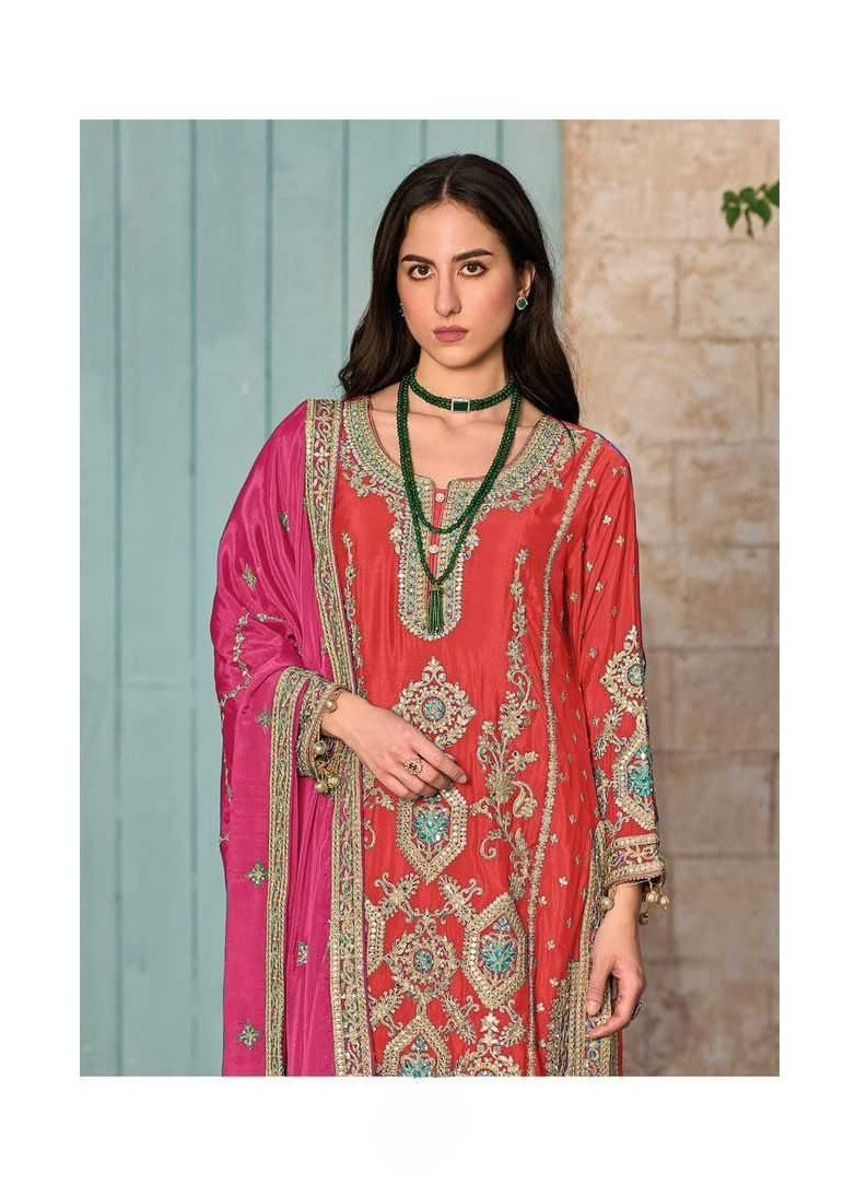 Elegant Embroidered Pink and Red Traditional Kurta with Trouser & Dupatta Set